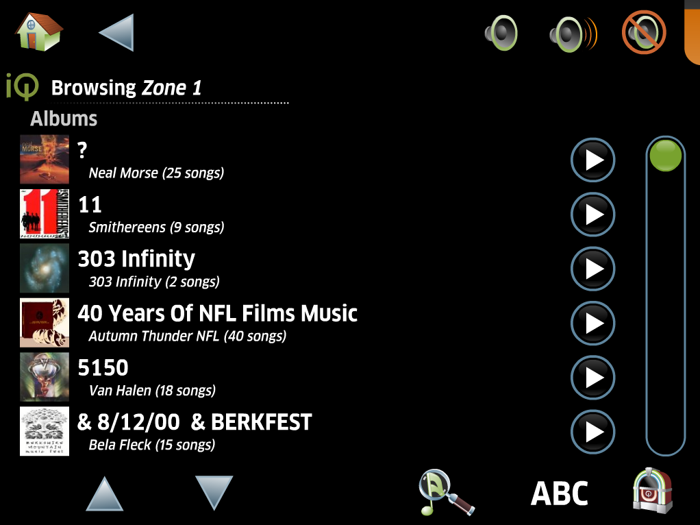 By pressing on the Up or Down arrows, the list of music will jump up or down one page. By pressing above or below the green indicator on the scroll bar, it will also jump up or down by one page at a time. To quickly move through the collection, you can drag the green indicator up or down on the scroll bar.